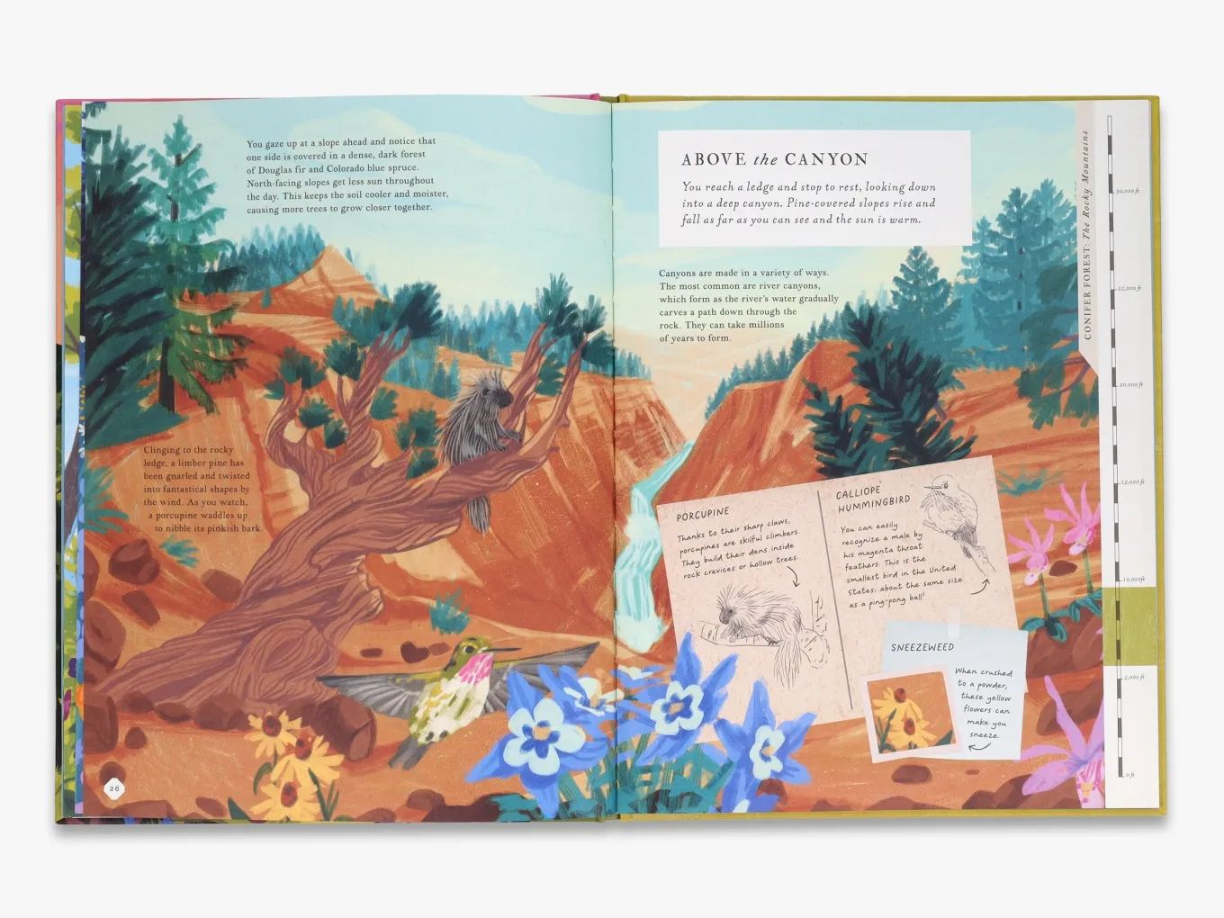 Using clever die-cut flaps and gatefold pages, the book details how mountains are formed, shows a cut-through of the interior structure of a mountain, and describes the effects of changing seasons and climates on mountains in different parts of the world. Expedition logs encourage readers to use their senses to explore each location as they climb.